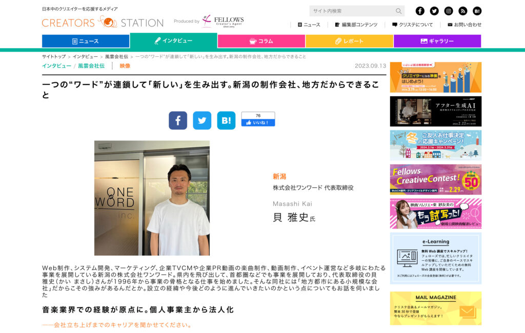 日本中のクリエイターを応援するメディア 「CREATORS STATION」さんに弊社代表が取材していただきました。